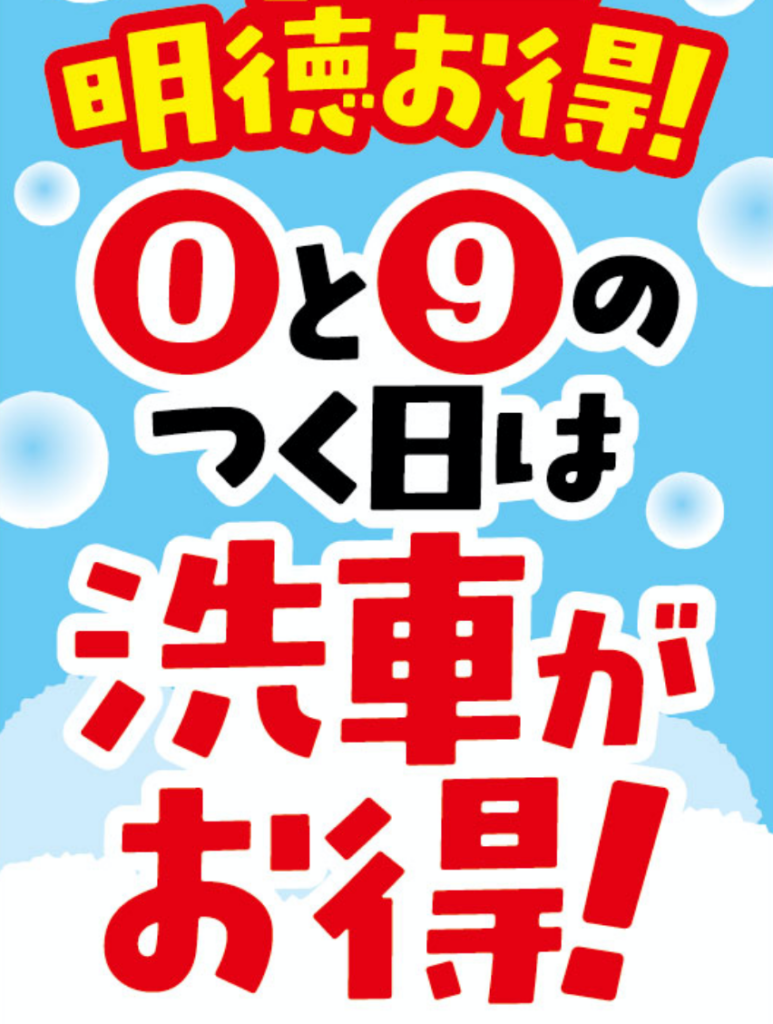 毎月9と10のつく日は洗車がお得! 2024.10.23 お知らせ 毎月9と10のつく日(毎月9・10・19・20・29・30日)は 「明徳お得」洗車がお得な2日間です! 当店自慢の洗車メニュー ・ティアラコートロイヤル ・シルキーコート ・ナノポリマー が30%割引でお得です! さらに「明徳お得デー」は、エアブローも無料開放します! この機会にぜひお試しください! お知らせ一覧